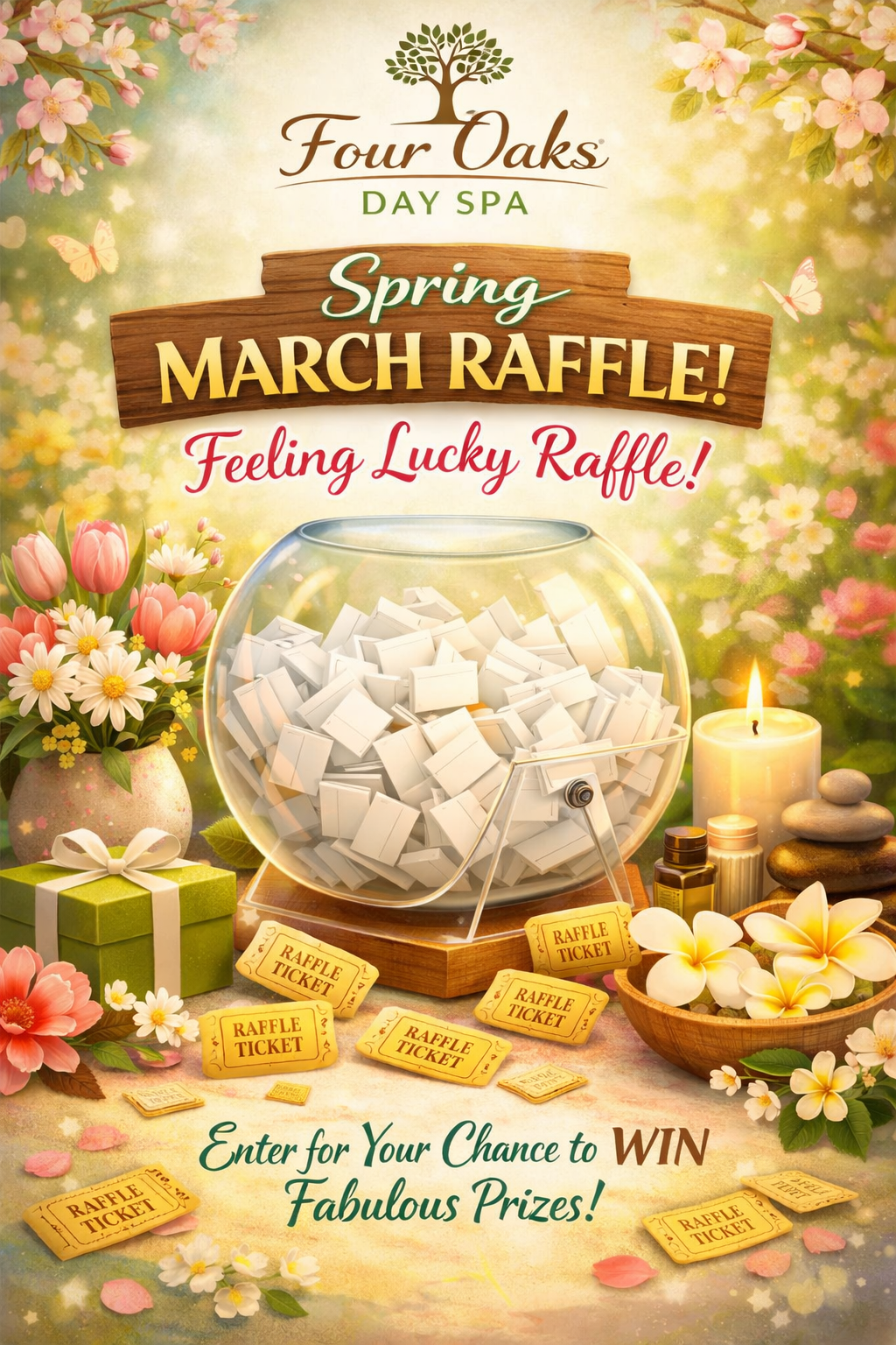 Feeling lucky this spring? ✨ Join the excitement at Four Oaks Day Spa and enter our Spring “Feeling Lucky” Raffle for a chance to win a luxurious prize. The lucky winner will have the opportunity to choose their dream experience: a 90-Minute Massage, a Body Scrub & Wrap (Partial), a 90-Minute Facial, or an Anti-Aging Facial. Don’t miss your chance to indulge in relaxation and rejuvenation!